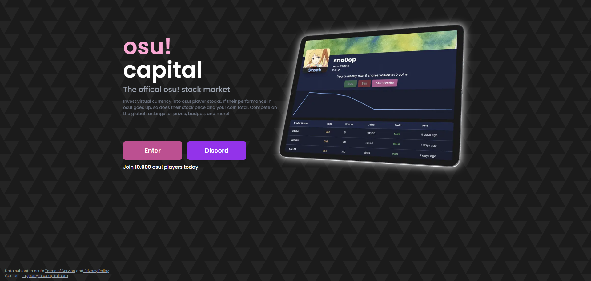 Currently working on v2 of a simulated stock exchange website, osu! captial, that mimics stock price based on player performance on the Osu! Rythmn Game.